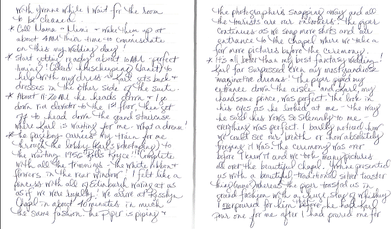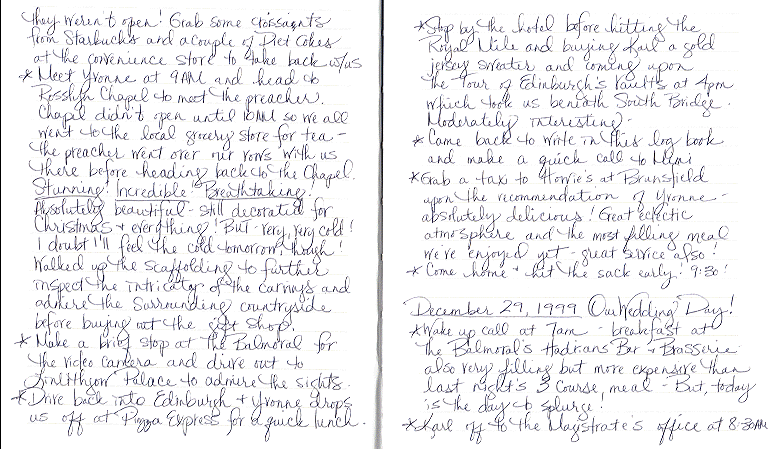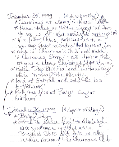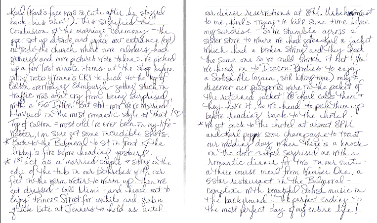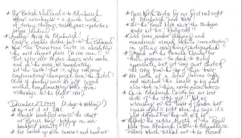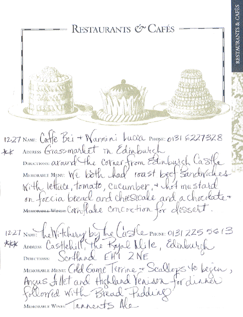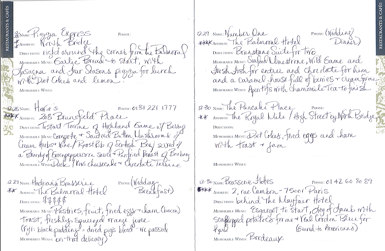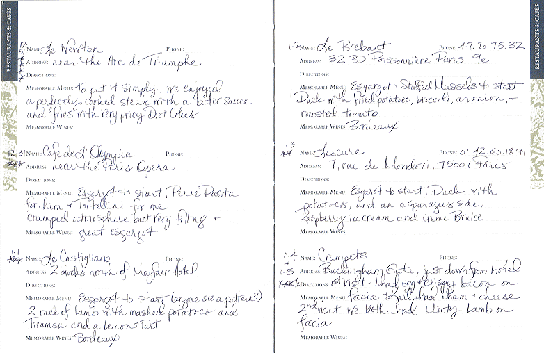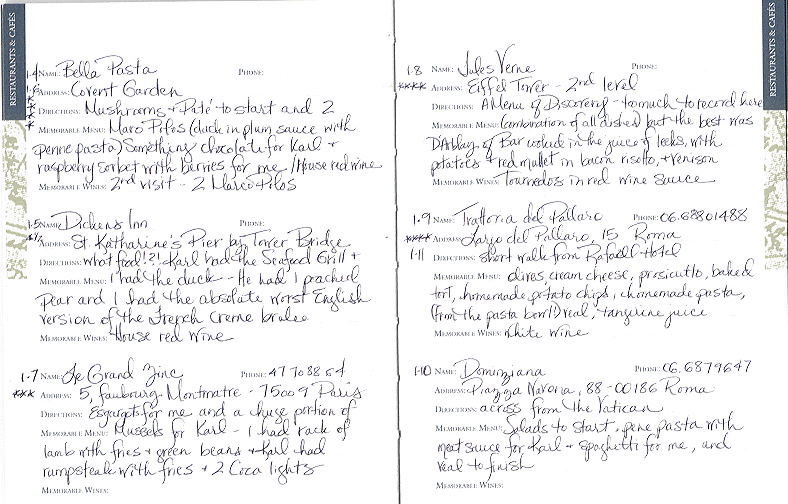 Katie kept a journal for the entire trip. In it, she included "reviews" of all the restaurants and hotels, as well as our daily adventures. I thought you might find it interesting, so I am including the actual pages from this well-traveled journal. I hope you enjoy them. |