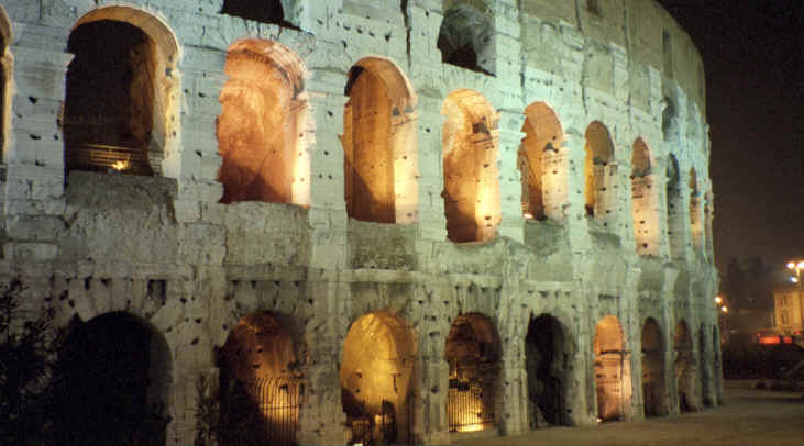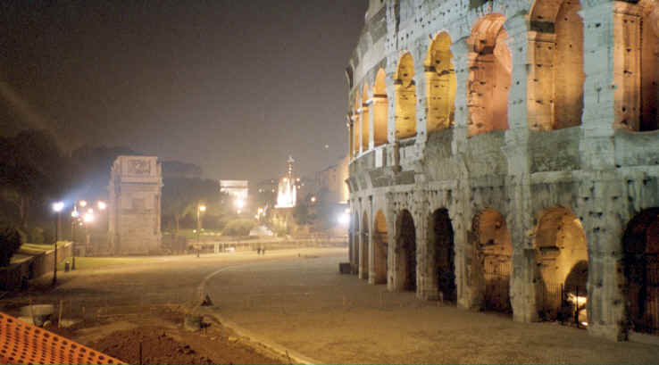 We had been here two days and had not seen any of the ancient Roman ruins, including the Colosseum, so we had a quick bite to eat and decided to walk down there for an evening stroll (did you think we were finished for the day...no way!). Anyway, we had a great walk as we approached the Colosseum. Of course it was closed; however, it was beautifully lit as were all of the other ruins in the area. We walked around and tried to take a few night pictures which actually came out really great. We spent the rest of the evening just enjoying the views while it was nice and quiet. We also managed to wander around onto Palantine Hill, although, we didn't know at the time that is where we were. |