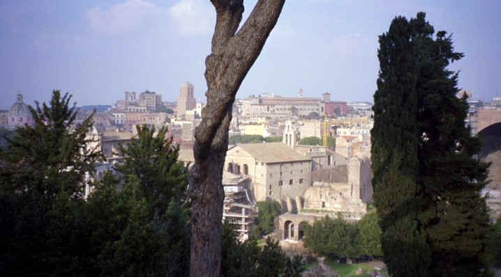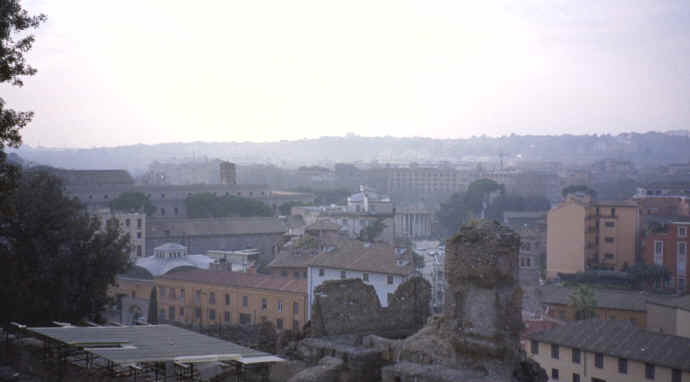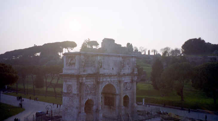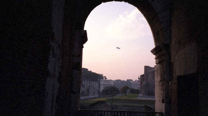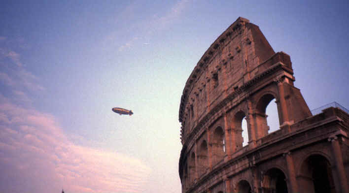 What do you think so far? Pretty impressive, huh? Well it was time for them to close up and the sun was beginning to set, so I looked back at Palantine Hill to get some great pictures. In addition, for some reason, the Goodyear Blimp was in town and I got some interesting shots of the blimp in the background (kind of an "old and new" theme). You know, I probably shouldn't even put the blimp pictures on the web. I sent them an email telling about the pictures and never got a response. You would think they would appreciate it! Also, we ended up getting the souvenir later that evening at the Trevi Fountain. It was a few lira more, but worth it just because we got to see the Colosseum (I also think it was a little nicer). |