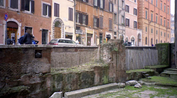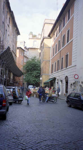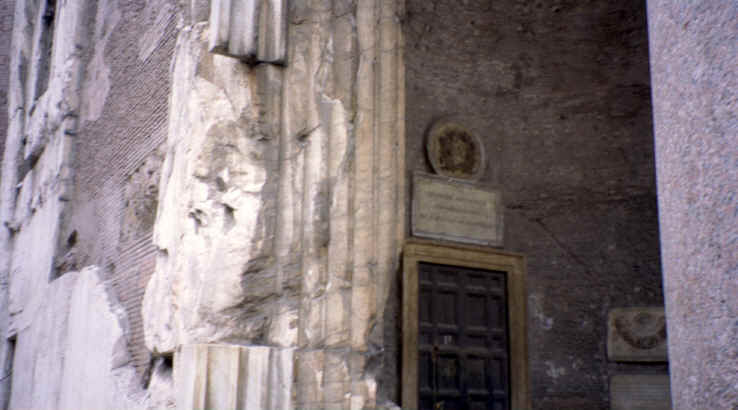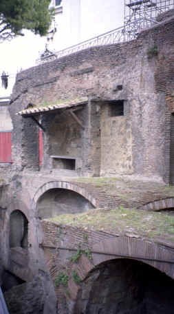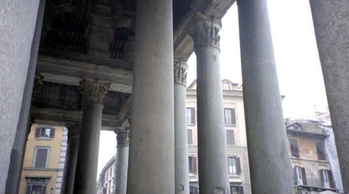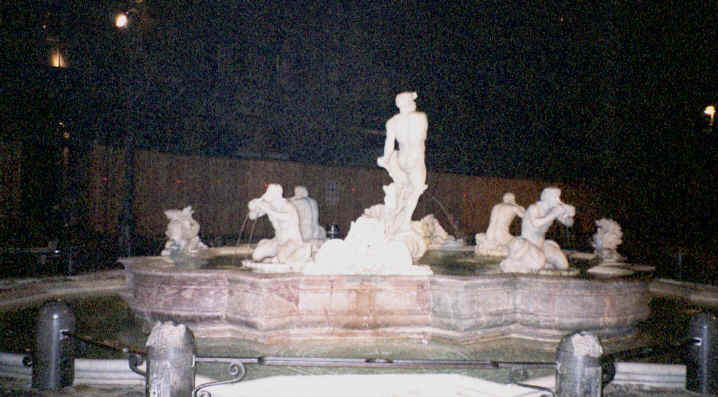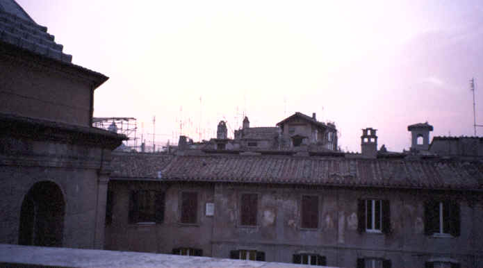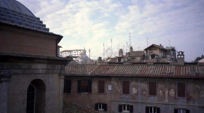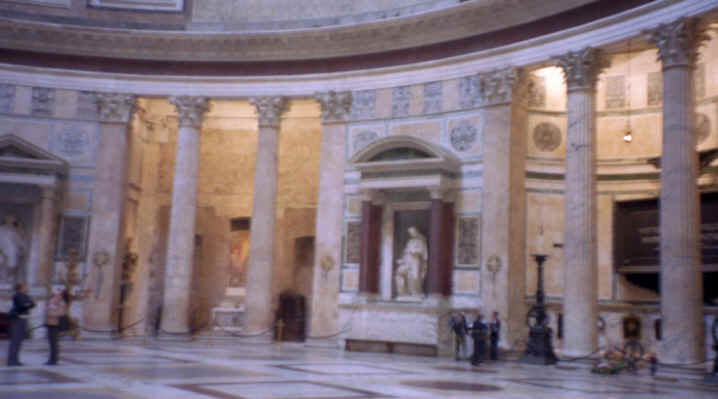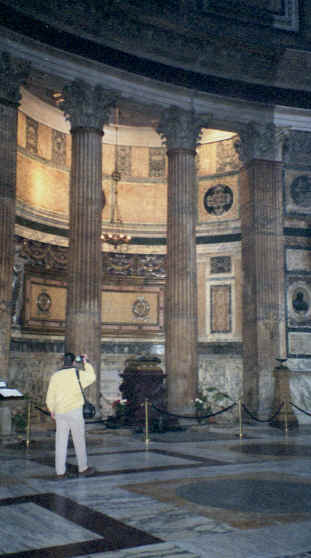 This was our next stop. Just a few blocks from Piazza Navona, this was a beautiful piece of architecture. It is the last of the great buildings of ancient Rome that is still intact. Built in 27 B.C., the most interesting feature is the large opening in the center of the dome at the top. There are beautiful marble statues, paintings and murals as well as the marble and terrazzo floor throughout that are open to the elements! This is also the only source of light for the now converted church. Michelangelo used this dome as a basis for the dome of St. Peter's Basilica (the Pantheon's dome is actually larger!). The walls are 25 feet thick and the 2 huge bronze doors weigh 20 tons each! This was very impressive. We came back on Saturday, when it was open to get the rest of the pictures you see here. The Pantheon is located on the Piazza Rotunda which, of course, includes another Egyptian obelisk, as well as a McDonald's. Can you believe it? They let them build a fast food restaurant across from one of the oldest structures still in use today! There were also some of the ruins of the old Roman wall surrounding the city that ran behind the Pantheon. |