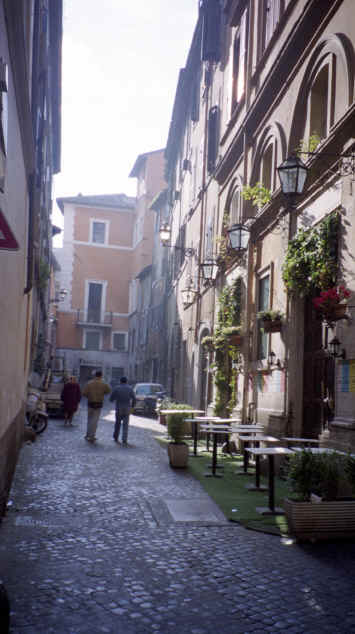 We continued along the top of the steps and walked along the hills overlooking the city. We were amazed (and at times, kind of nervous) at all the kids hanging out along the way to the park at the top of the hill. They were scooters all over the place. This was the hangout for the kids! We got to the top of the hill walking along the ancient Roman wall until we got to the park. Again, it was packed, but with a little more seedy crowd. There was an overlook there and we saw a beautiful piazza at the bottom, so we decided to walk down there. There were these neat winding stairs that took down to the Piazza del Popolo. This was a huge square. Guess what? That's right, another Egyptian obelisk! There are two huge churches on each side of the courtyard. We then proceeded back toward the hotel to start thinking about eating. Romans don't even start thinking about dinner until at least 8:00 and usually not until 9:00 or later! |