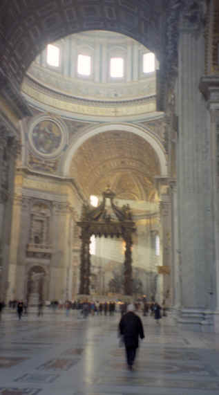 We walked up the long steps into St. Peter's Basilica. It is purported that Saint Peter is actually buried here and they have occasional tours into the crypts to see his supposed last resting place. Unfortunately, we missed that; however, the church was awe inspiring in itself. This is actually the second church on this as Constantine commissioned the original that took many, many years to complete. The current structure was built during the time of Michelangelo and Raphael. Included inside is the famous statue by Michelangelo called the Pieta'. The whole church is adorned with gilt, marble and mosaic tiles throughout. |